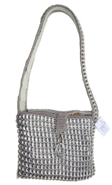 Sac capsules AMBRE a été réalisé en 13 heures avec 1,014 capsules de canettes inoxydables recyclées: triées, lavées, désinfectées, calibrées, assemblées au crochet avec du coton gris perle.